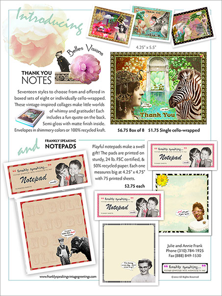 The product line, including cards and notepads, as well as marketing materials were created for this greeting card company. Creations for marketing included letterhead, email campaigns, flyers, sell sheets geared for sales representatives, logos, labels, catalogs and package development.
